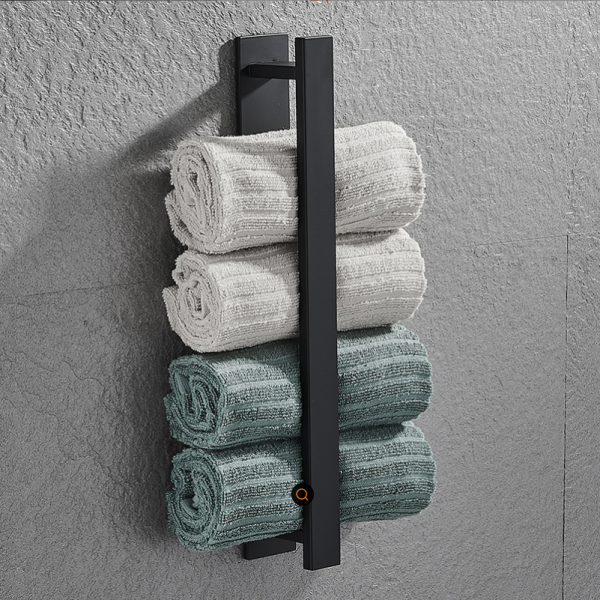 Een klein, 40cm hoog, zwart handdoekenrek welke u met tape aan de muur kunt bevestigen. In de gleuf met een diepte van 5cm kunnen kleine handdoeken opgerold opgestapeld worden.