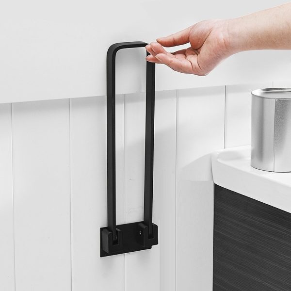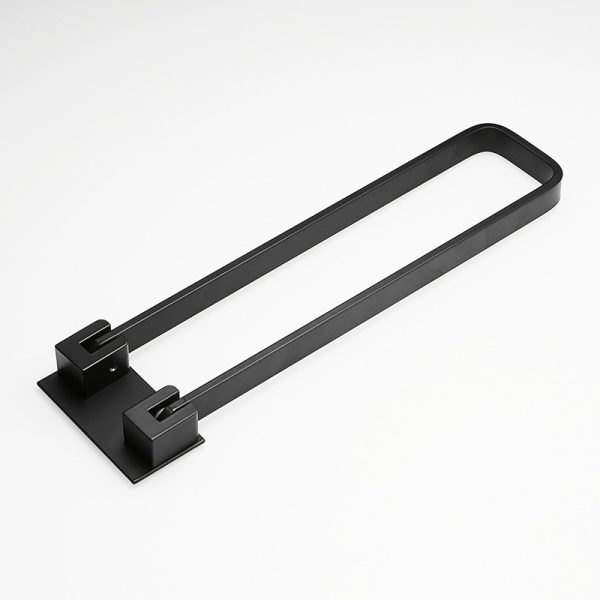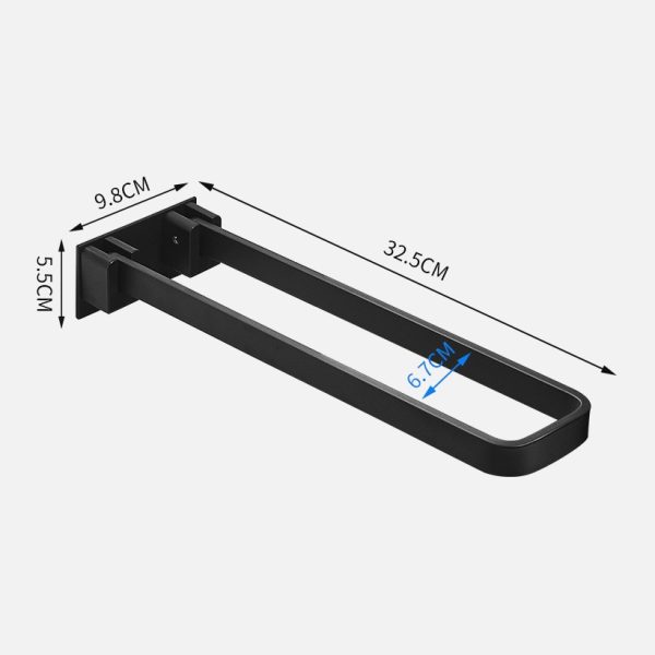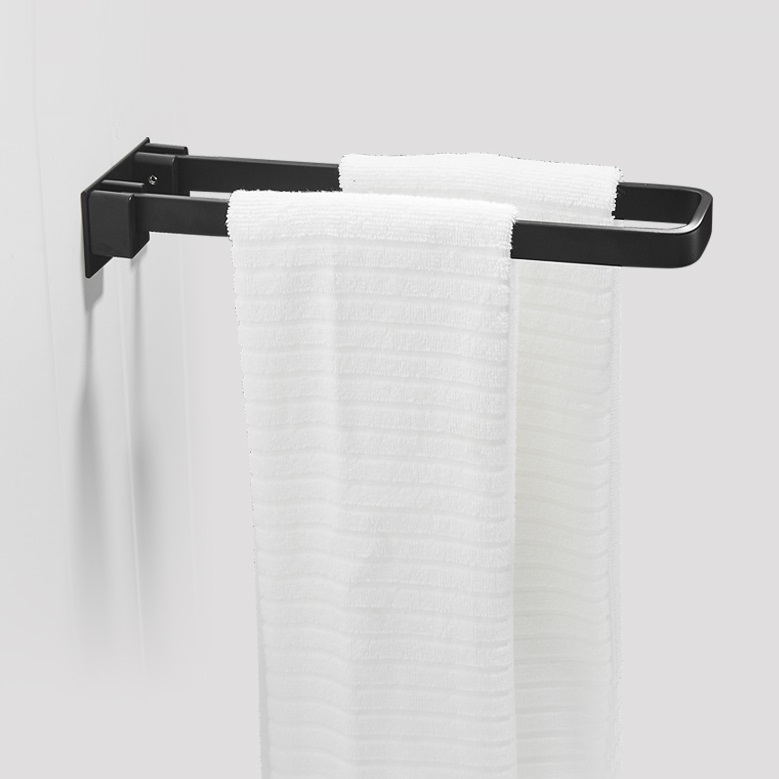 Een zwart handdoekenrek welke u met bijvoorbeeld lijm (niet bijgeleverd) aan de muur dient te bevestigen en opklapbaar is.