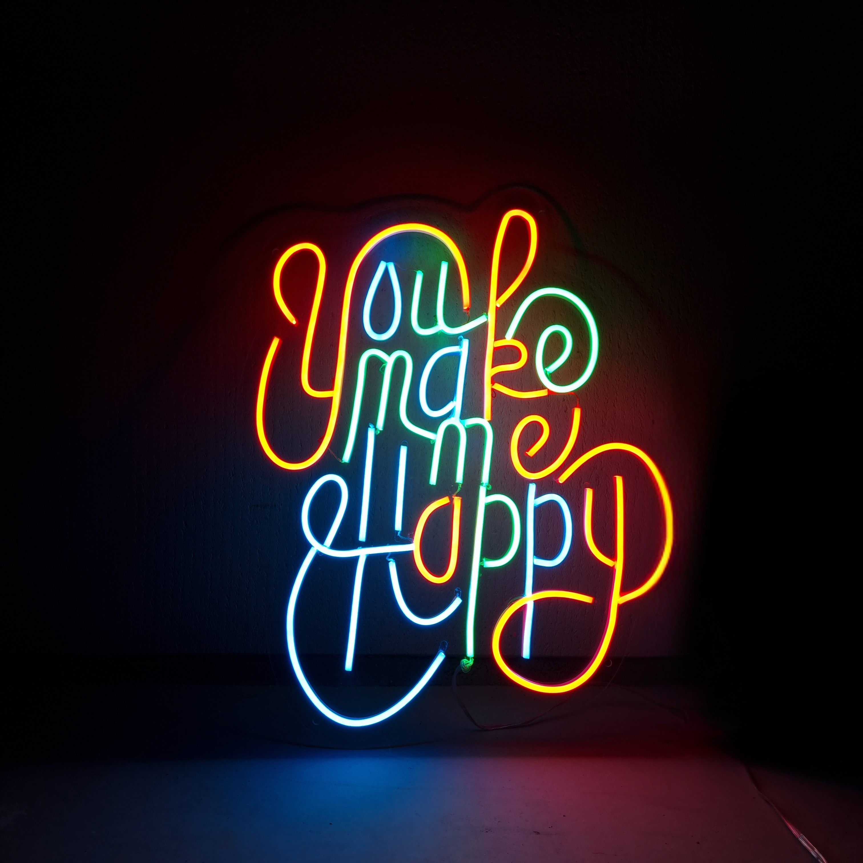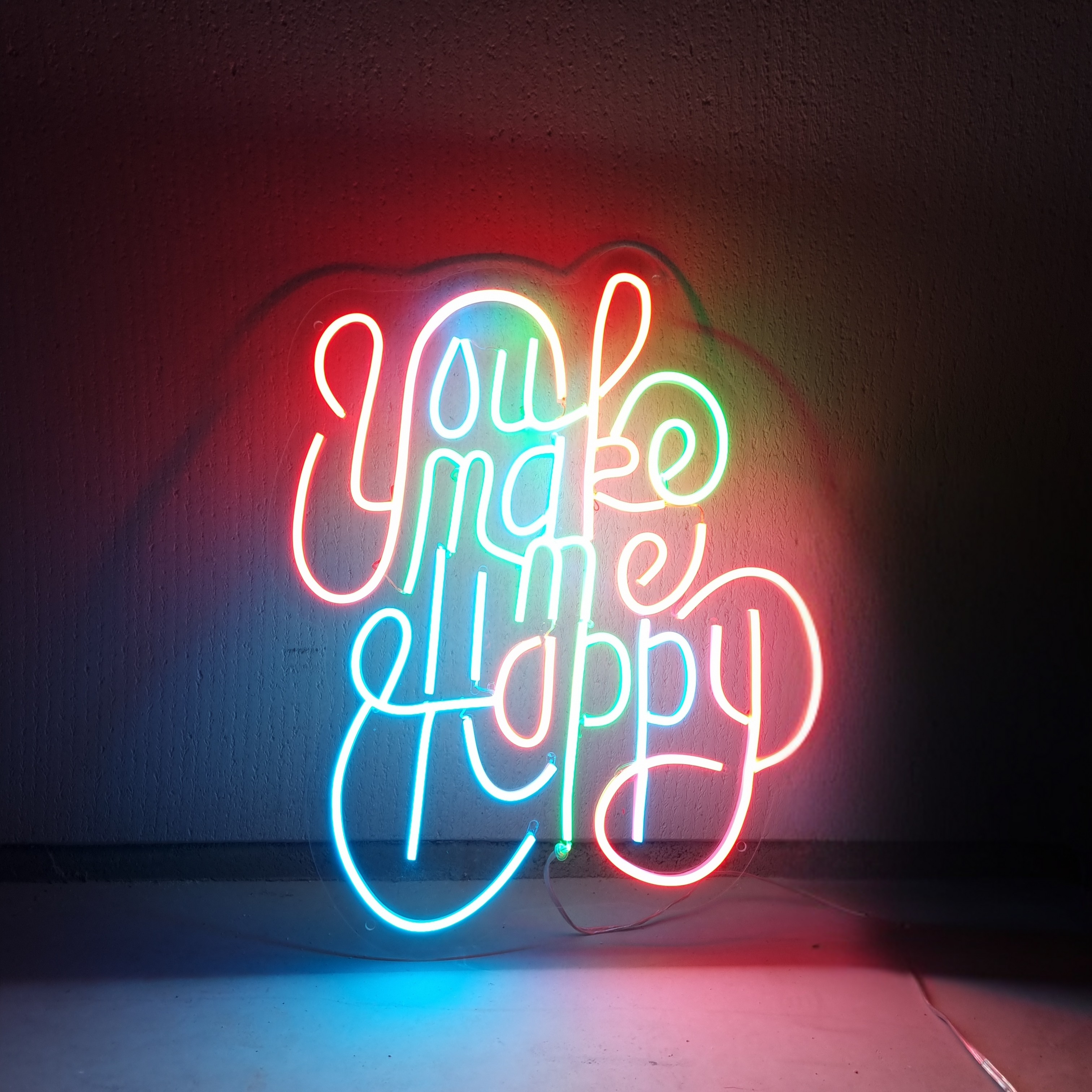 Breng warmte, kleur en een positieve vibe in elke ruimte met dit prachtige LED neon bord met de tekst "You make me happy". Dit unieke lichtkunstwerk combineert een speels lettertype met levendige kleuren, waaronder rood, blauw en groen, waardoor het een echte blikvanger is.