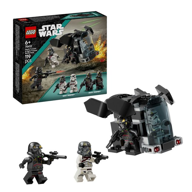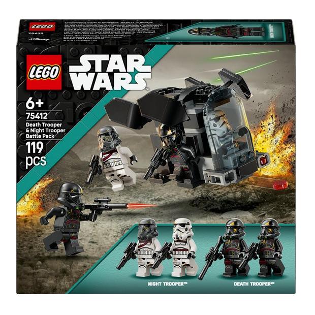 Laat kinderen hun eigen troepen bouwen en spannende missies naspelen uit LEGO Star Wars: Death Trooper en Night Trooper Battle Pack (75412). Deze speelset bevat een compact dropship met ruimte om vier LEGO minifiguren achterin te vervoeren, een cockpit met afneembare koepel en twee noppenschieters voor actievolle gevechten.