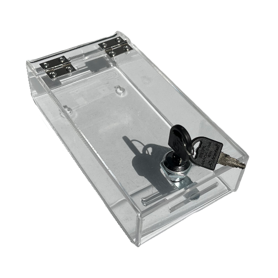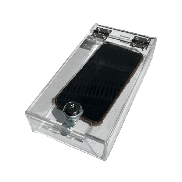 Een plexiglas telefoonkluis met 2 sleuteltjes.